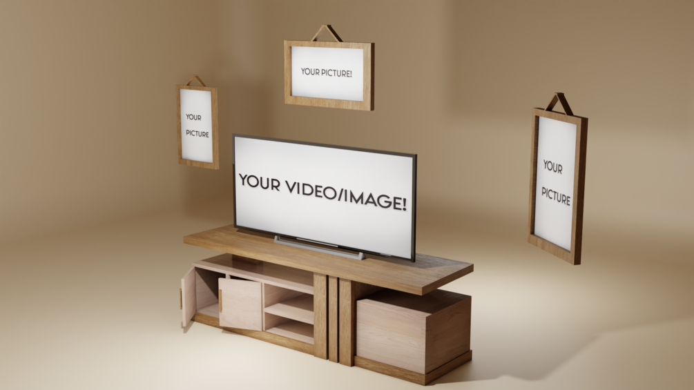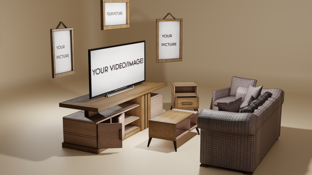 In addition, all the picture frames and the TV are already correctly mapped and to place your image, just change the material, simple and fast, giving you more authenticity in the project.